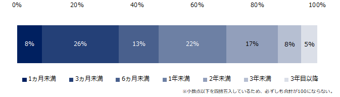 内訳を見ると、「1カ月未満」が8%、「1カ月以上3カ月未満」が26%。あわせて3割以上が、入社から3カ月以内に職場を離れていることになります。