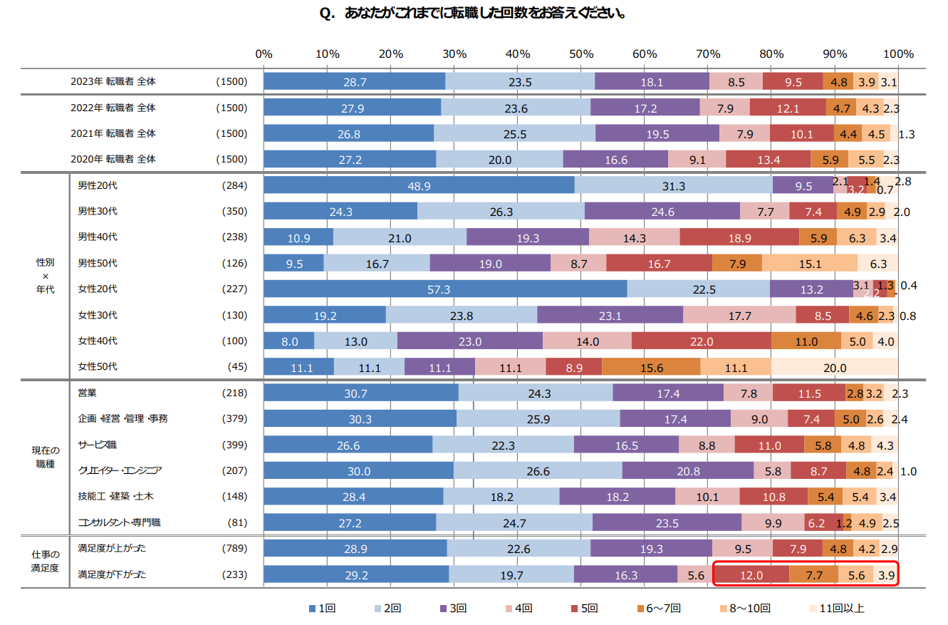 つまり、2回目までは一定のボリュームゾーンであり、極端に目立つわけではないということです。とはいえ、3回以上になると割合は9.5%(女性13.2%)と、一気に減少傾向にあり、人事からの印象も慎重になります。